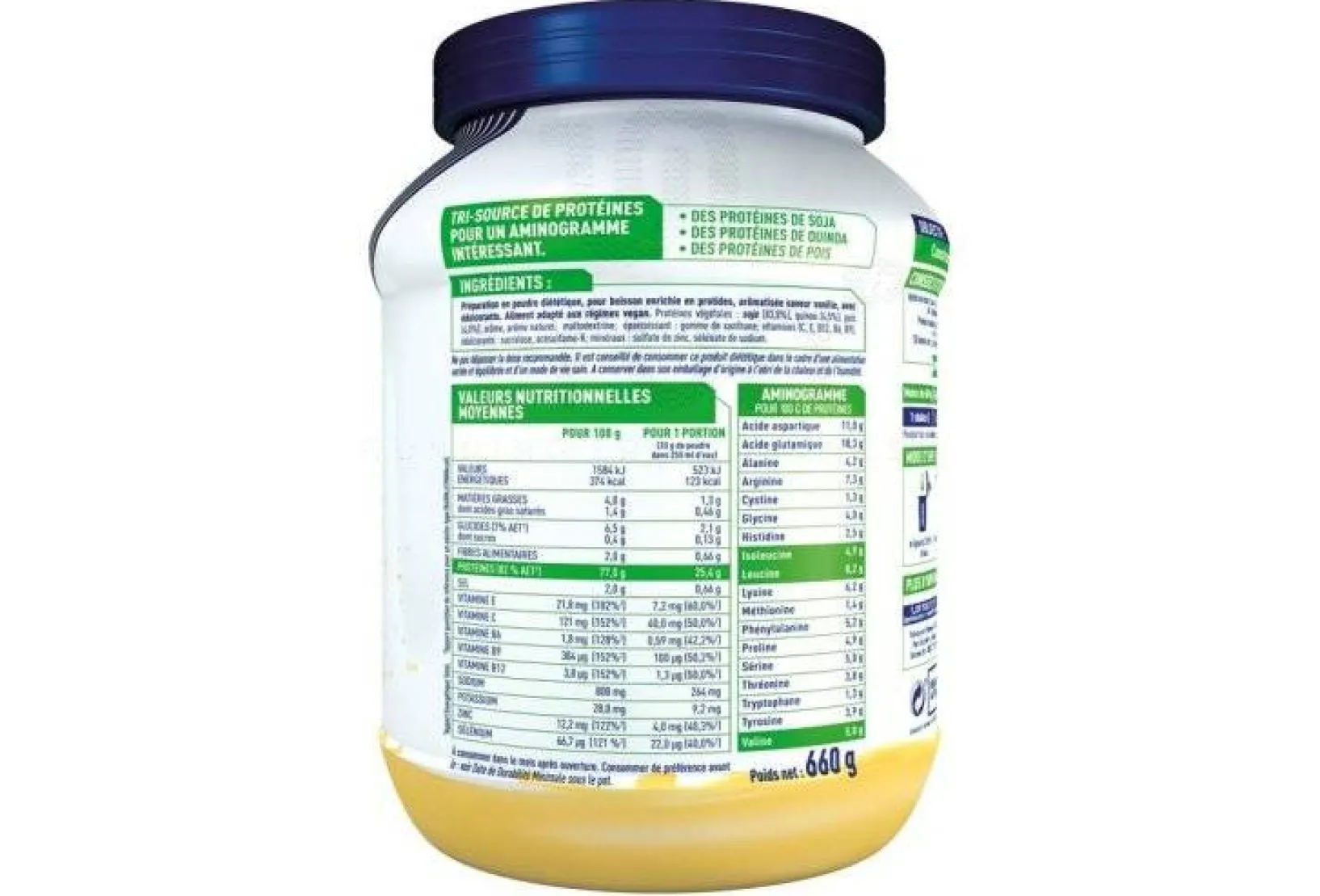 - Protéines végétales (soja, quinoa et pois) : acides aminés