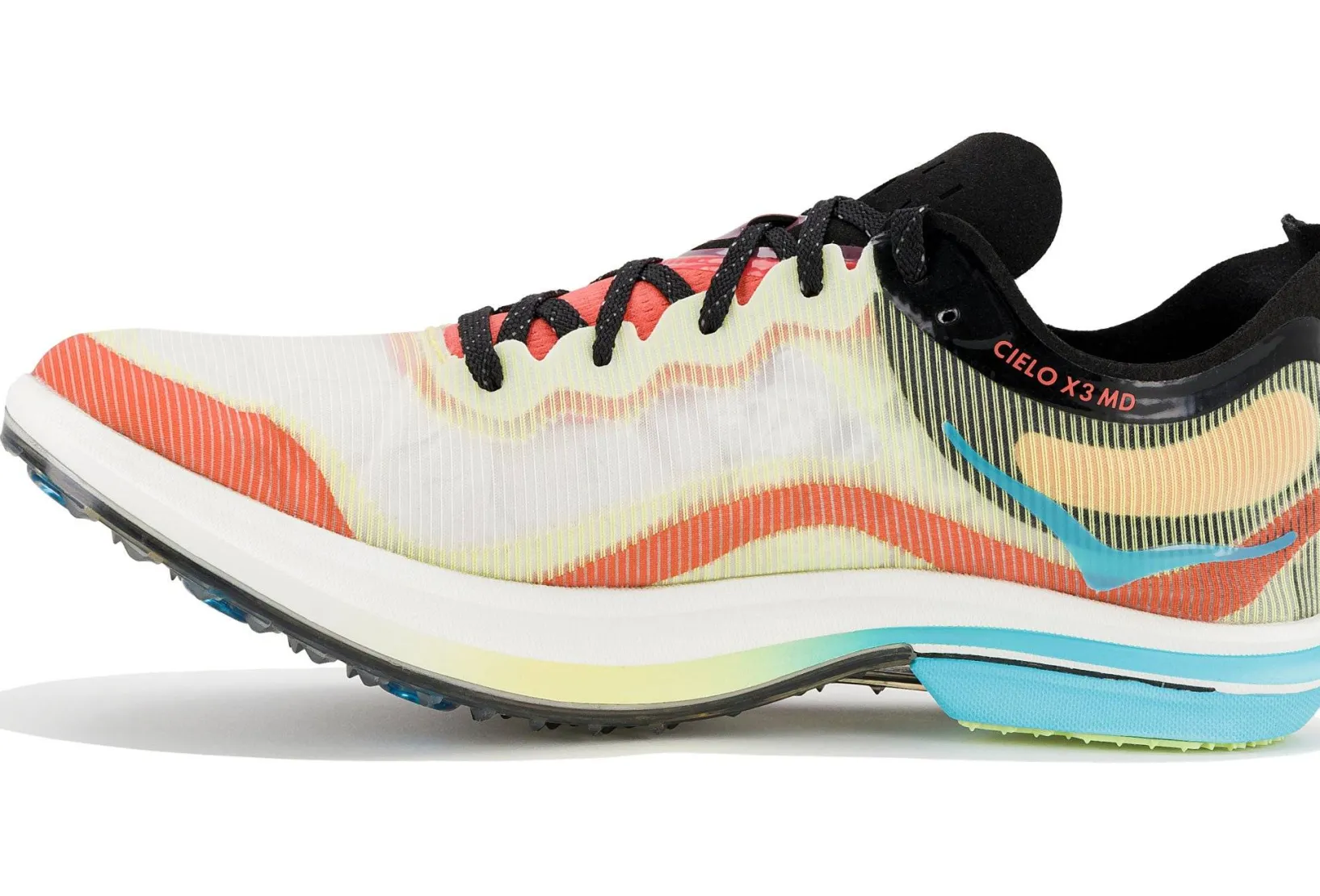 La chaussure Hoka Cielo X 3 MD pour homme vous fait gagner en vitesse lors de vos compétitions d’athlétisme de moyennes distances.