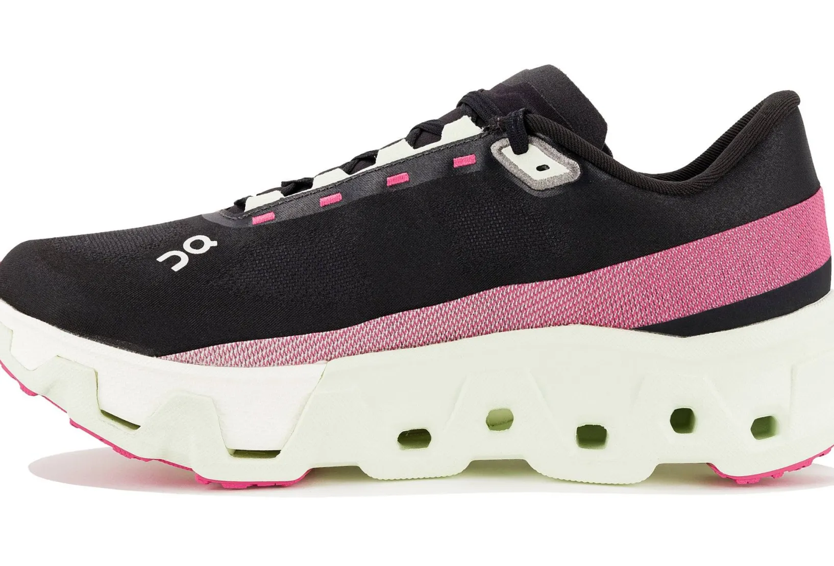 - Empeigne (partie supérieure qui enveloppe le pied) : inspirée du modèle le plus compétitif de On, elle facilite la circulation de l’air pour vous offrir une respirabilité indispensable. Elle veille à une stabilité maximale au niveau du talon et se dote de lacets antidérapants pour éviter les désagréments.