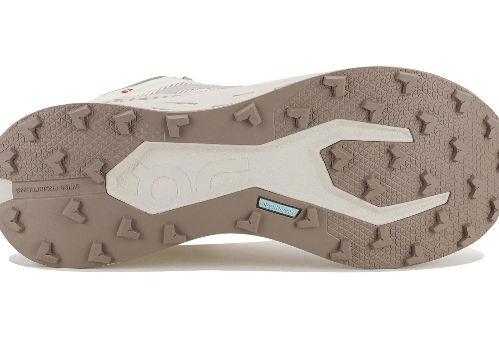 - La semelle extérieure Missiongrip combine des motifs d’adhérence multiples pour garder le contrôle dans des conditions météos changeantes.