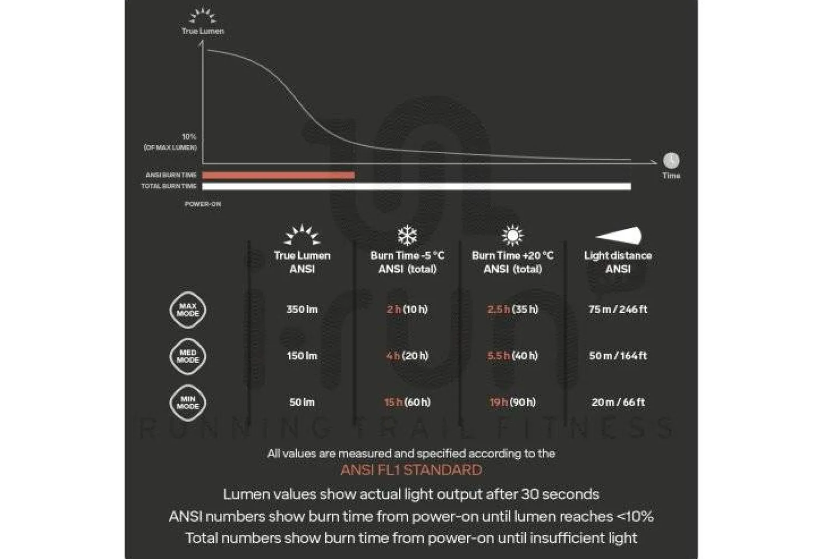 - Lumens : 50 (mode min), 150 (mode med) et 350 (mode max)